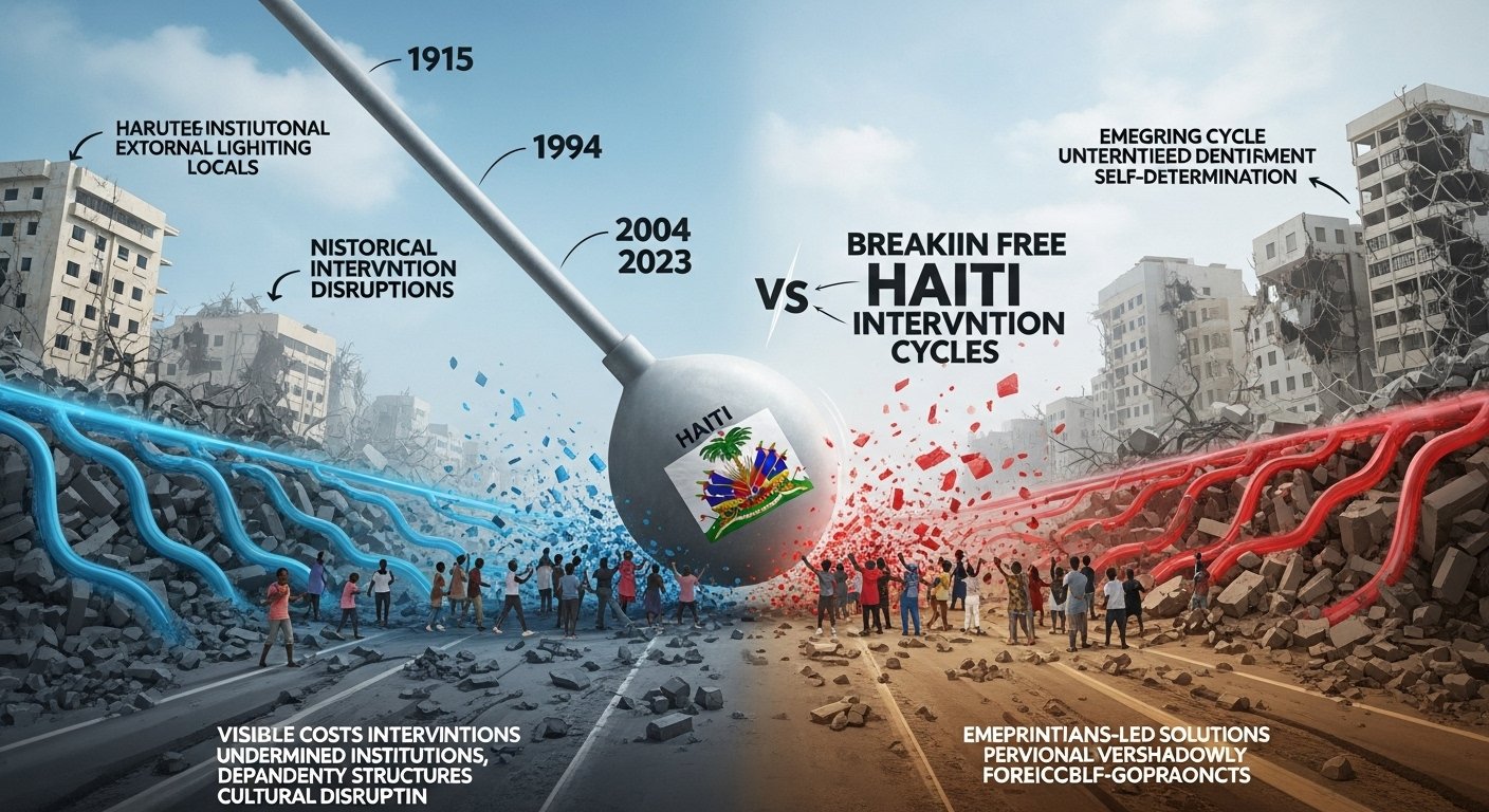 The article argues that Haiti can no longer afford foreign intervention, highlighting the sovereignty deficit, the thwarting of economic self-determination, and the erosion of cultural identity and national confidence.